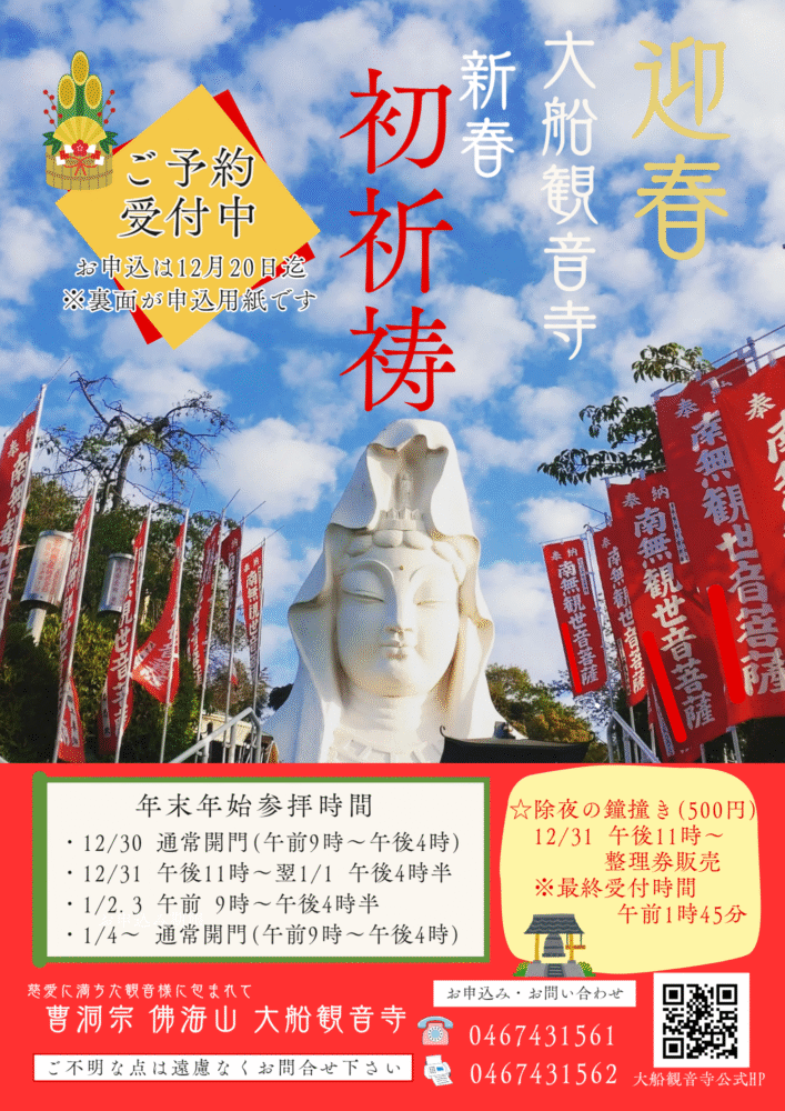 今年は、大晦日12月31日から年明けの1月1日まで、夜通し開門する予定です。 貞昌院と併せて、大船あ観音寺にもぜひお参りください。