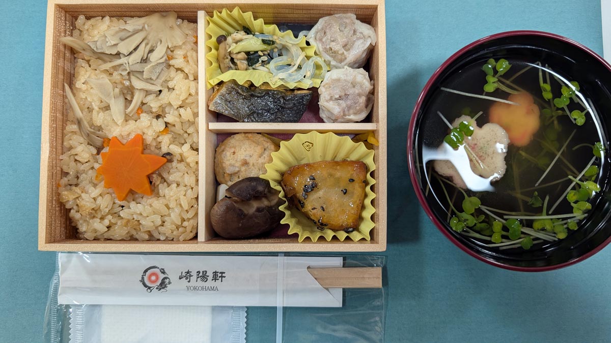 今回は、お弁当とお吸い物、抹茶ムースというメニューでした。