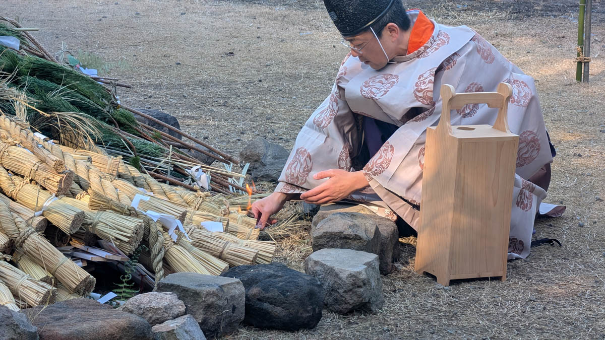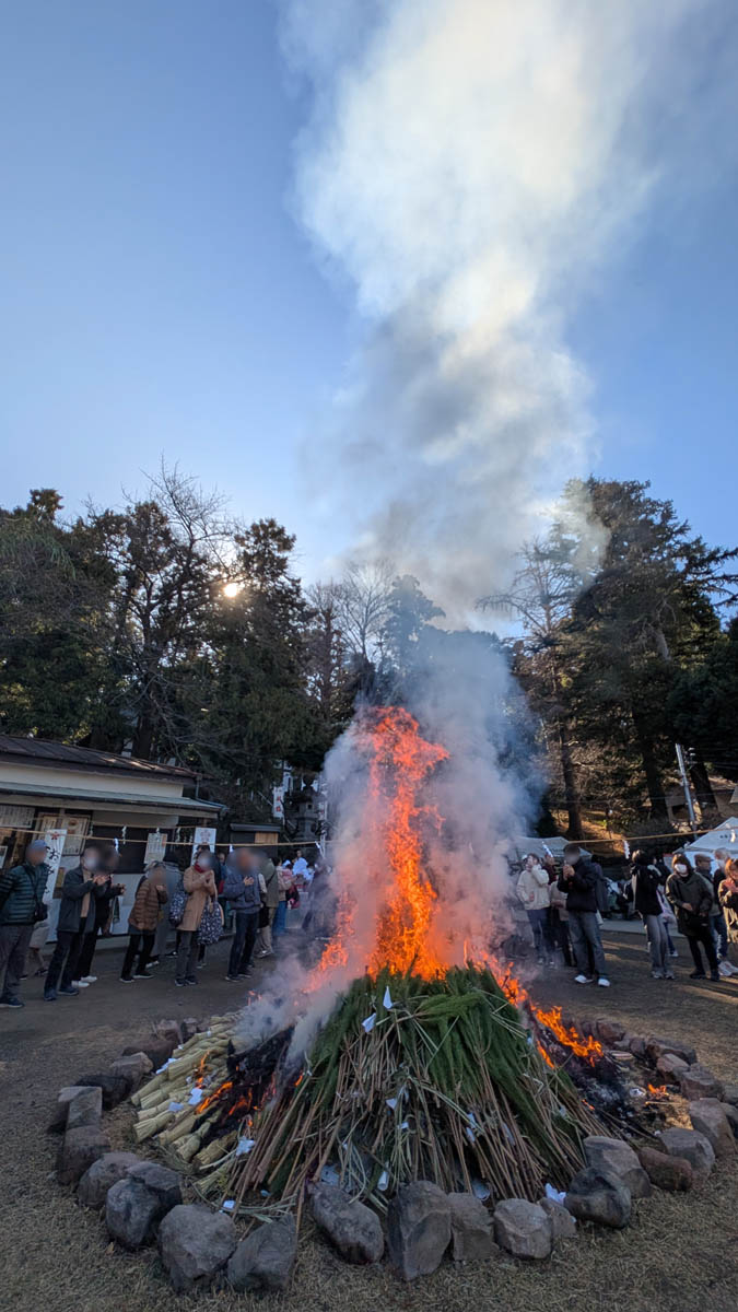神事の後、神主さんによって火がつけられ、いよいよどんど焼きが始まります。