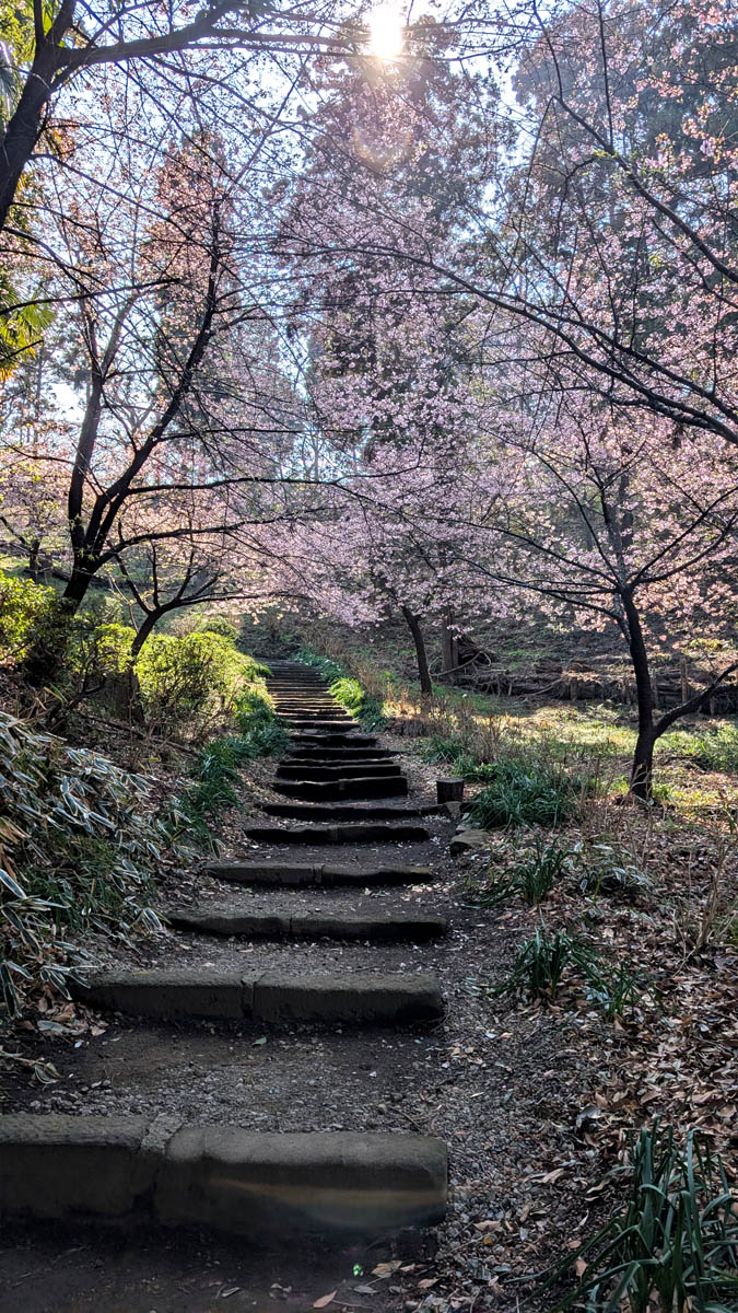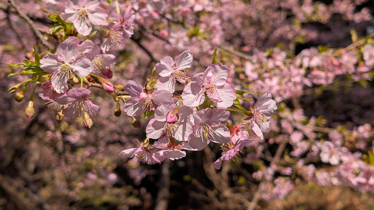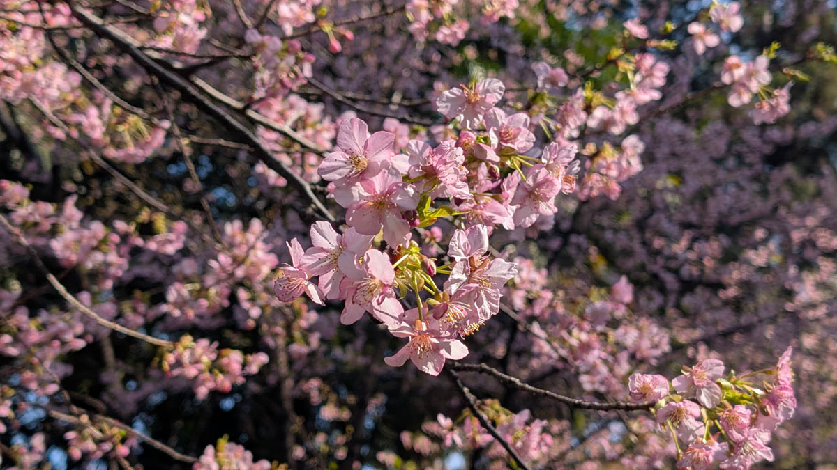 河津桜は、桃色が濃い花を咲かせますので、境内が一気に華やかになります。