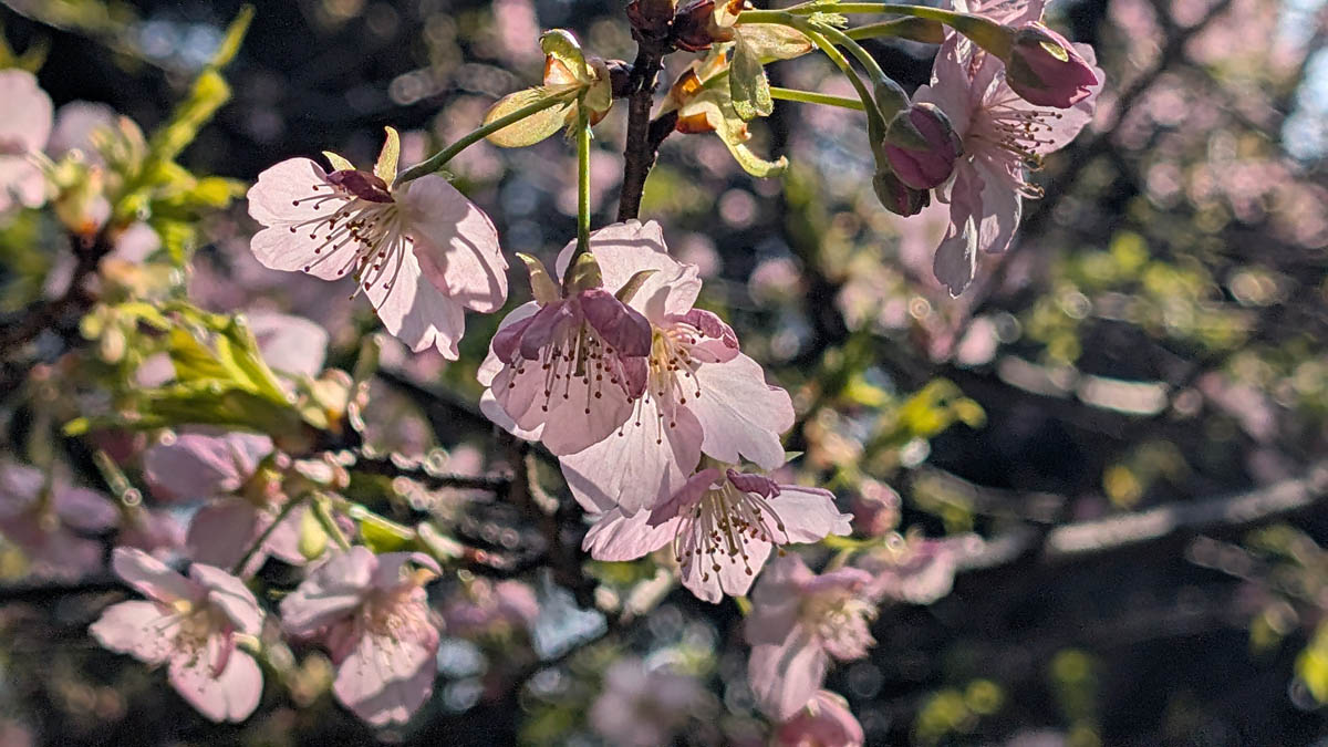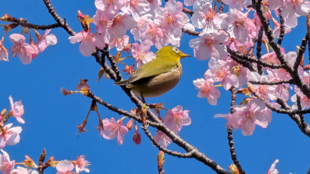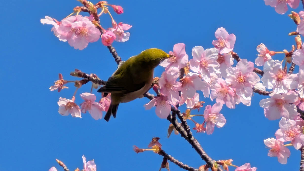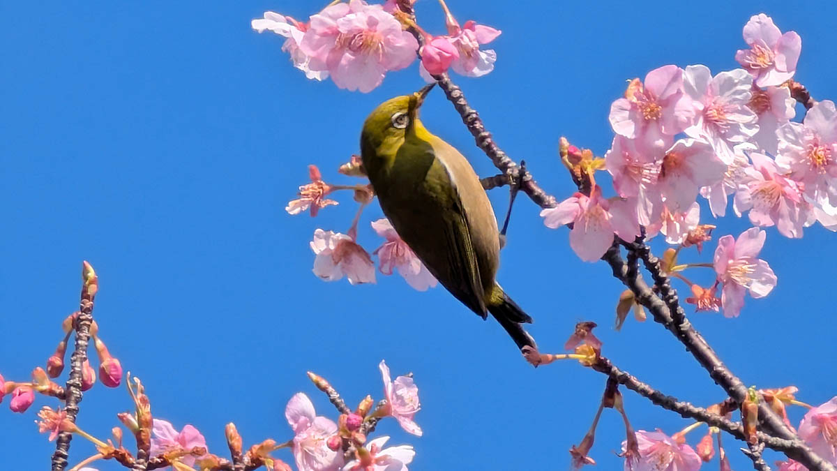 陽射しの温かさにつられて、メジロなどの鳥も蜜を求めて活発に飛び回っています。